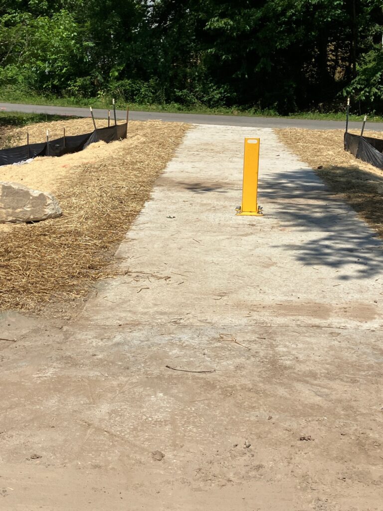 For several years we’ve been working with the Parks and Public Works staffs in Durham to put in a sidewalk connector from Dallas Street. In the next few weeks the City is scheduled to do a major clean-up of the existing dirt culvert to remove small trees, brush and accumulated trash, install 16’ of concrete culverts, cover these culverts to about 4” below the level of the ATT, and perform minor grading of the grassy area to prepare it for sidewalk forms. Using donations from the Tobacco Road Marathon and many individual donors, TRTC will fund the building of a 7’ wide sidewalk that will notably improve trail access for area residents. This access way will connect on the west side of the ATT just south of the bridge at S. Roxboro Road. FINAL UPDATE: Construction began in late May, 2024 and was completed in about 5 days. Our contractor was able to build the access using reinforced concrete at a better price than with asphalt and Durham Parks & Recreation supplied a high quality knock down bollard. See the picture below shortly after completion. The thorough clean-up of the nearby ATT culvert eliminated a long standing problem of standing water and the neighbors really appreciated what the City did to improve drainage of the lower section of Dallas Street.